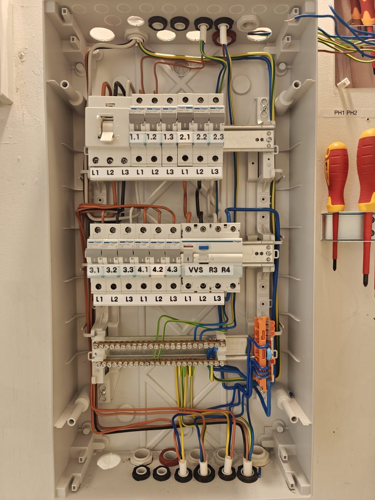 Kaavojen jälkeen siirryin omaan koppiini viimeistelemään 12 johtoa keskukseen -asennustani. Tavoitteena oli tehdä työstä siisti, looginen ja fiksu – ja onnistuin siinä hyvin. Sain kytkennän valmiiksi, otin siitä valokuvat ja dokumentoin työn, minkä jälkeen purin koko keskuksen.