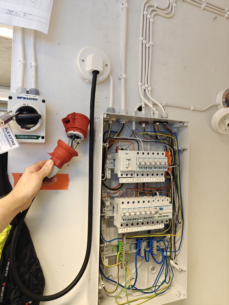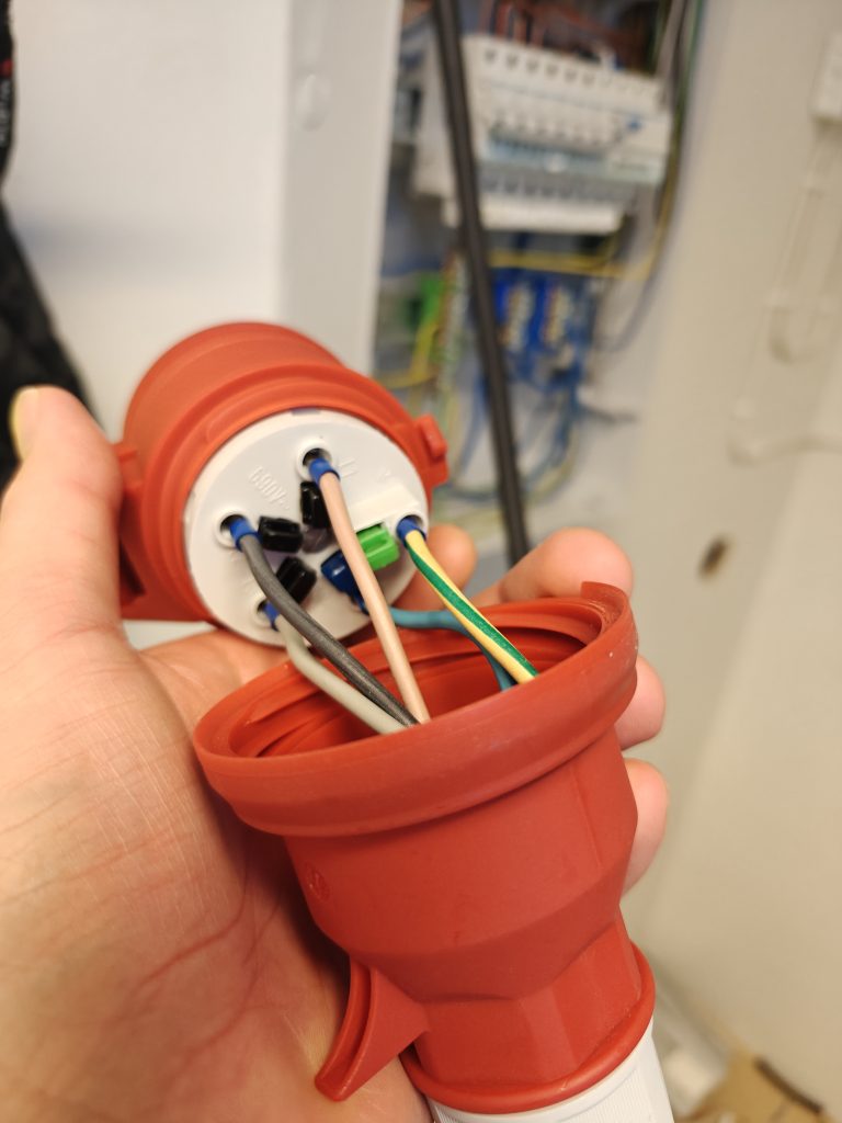 - Kumikaapelin toinen pää kytkettiin kolmivaihepistorasiaan, jossa käytin myös holkitettuja liitäntöjä varmistaakseni hyvän kontaktin.
